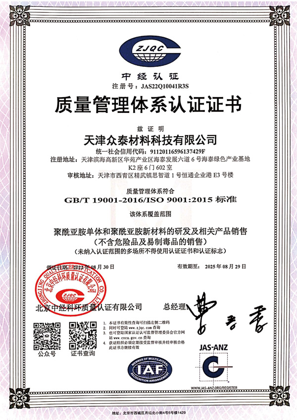 天津眾泰材料科技有限公司(以下簡稱“眾泰”),是一家“以先進功能性聚酰亞胺單體研發生產為核心,致力于推動全球聚酰亞胺材料產業發展”為使命的創新型高新技術企業。眾泰研制的聚酰亞胺單體目前已廣泛應用于無色透明柔性聚酰亞胺薄膜、柔性顯示材料、5G新材料等諸多高科技領域產品的生產。